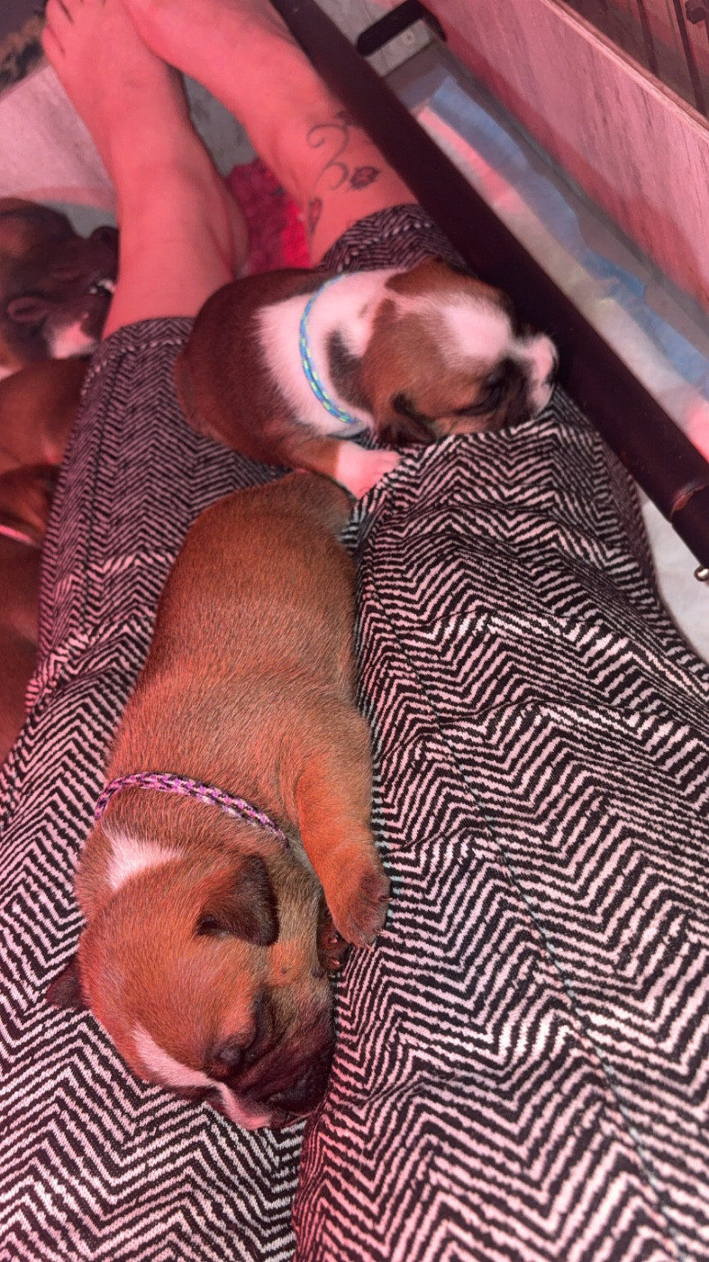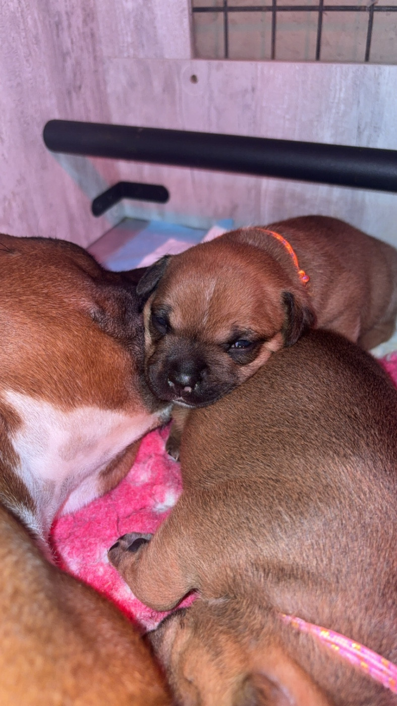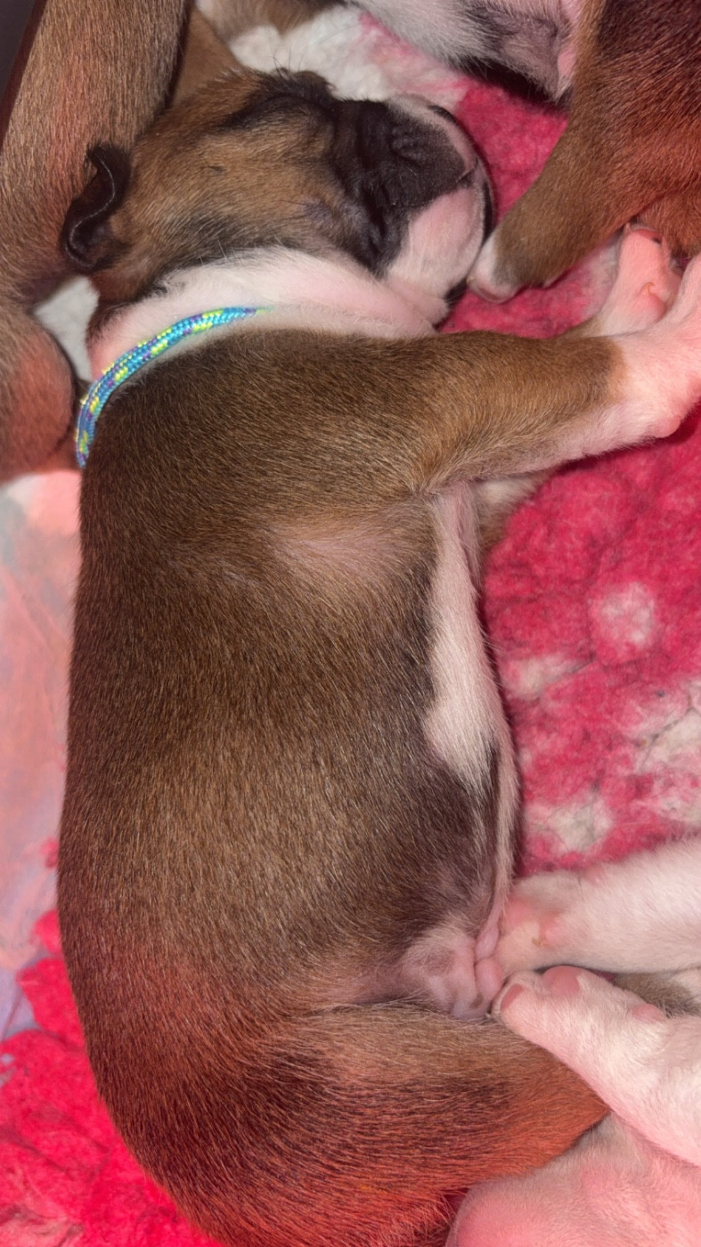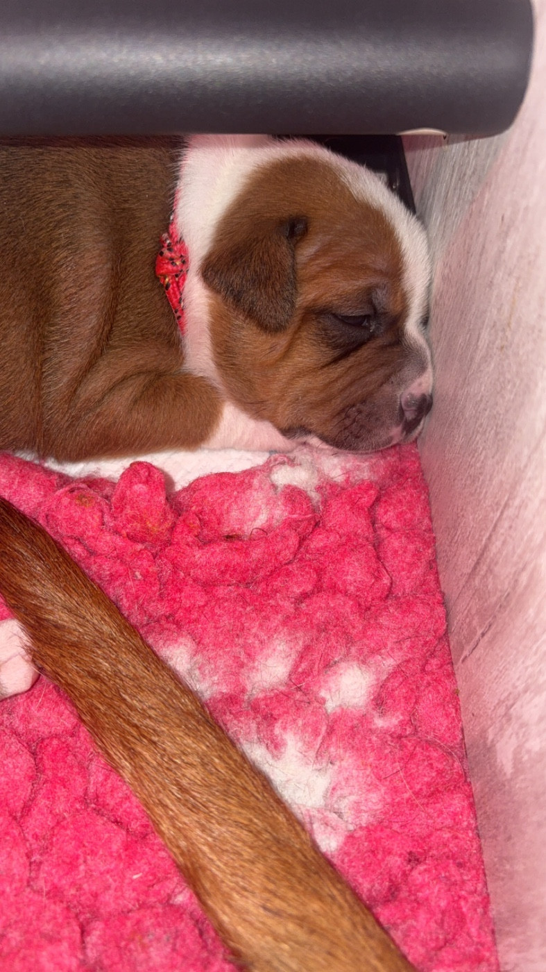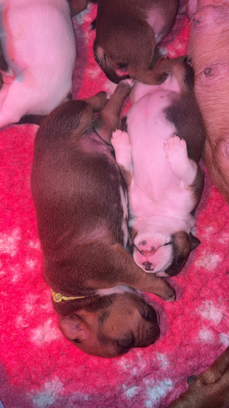 Chiot umi Femelle collier rouge Sa dort le ventre plein bien rond Mâle collier orange Male Tous à la cantine